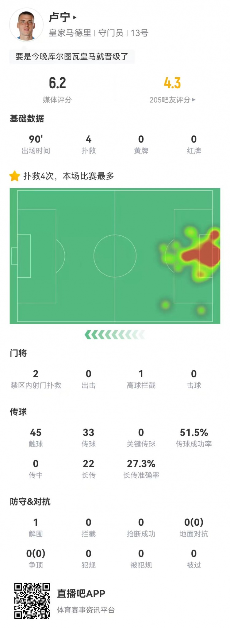 4月16日讯 皇马在本轮欧冠客场3-4再负拜仁,卢宁本场数据如下: