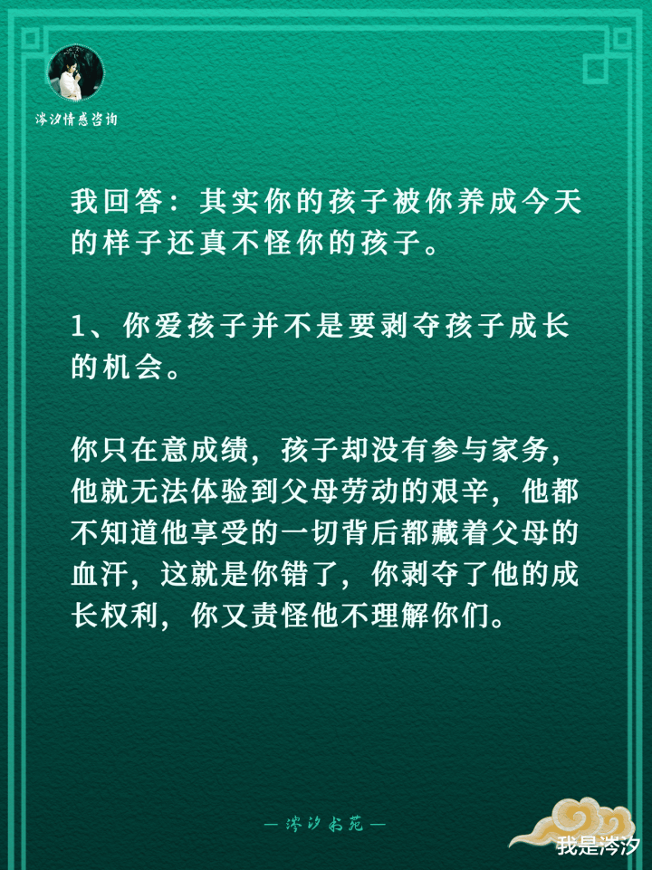 我复兴:其实你的孩子被你养成今天的表情还真不怪你的孩子。1、你爱孩子并不是要打劫孩子成长的契机。你只介怀获利,孩子却莫得参与家务,他就无法体验到父母做事的机密,他皆不知谈他享受的一切背后皆藏着父母的血汗,这即是你错了,你打劫了他的成长权益,你又驳诘他不睬解你们。