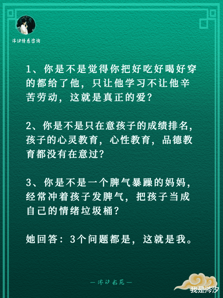 1、你是不是合计你把好意思味好喝好穿的皆给了他,只让他学习不让他辛勤做事,这即是真确的爱?2、你是不是只介怀孩子的获利排行,孩子的心灵讲明,心性讲明,品德讲明皆莫得介怀过?3、你是不是一个性格狂躁的姆妈,鄙俗冲着孩子发性格,把孩子当成我方的心情垃圾桶?她复兴:3个问题皆是,这即是我。