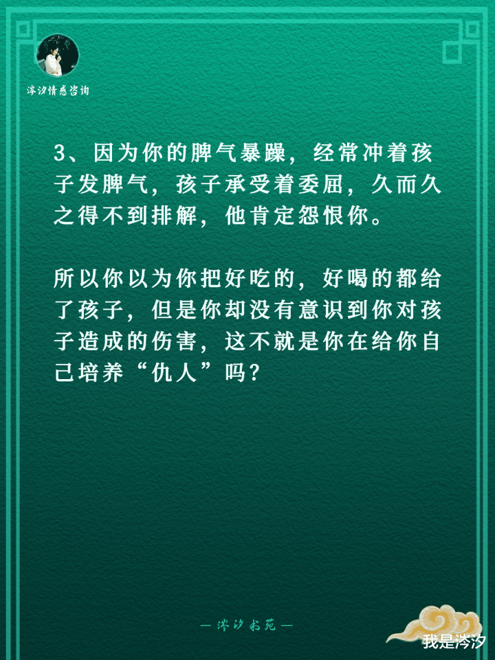 3、因为你的性格狂躁,鄙俗冲着孩子发性格,孩子承受着闹心,久而久之得不到排解,他确定归咎你。是以你以为你把好意思味的,好喝的皆给了孩子,然则你却莫得签订到你对孩子变成的伤害,这不即是你在给你我方培养“仇东谈主”吗?