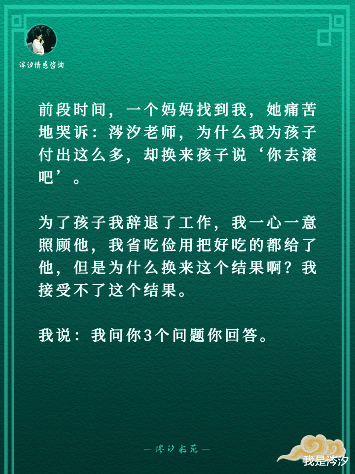 前段时刻,一个姆妈找到我,她痛苦地哭诉:涔汐敦厚,为什么我为孩子付出这样多,却换来孩子说‘你去滚吧’。为了孩子我除名了责任,我一心一意关注他,我省吃俭用把好意思味的皆给了他,然则为什么换来这个成果啊?我摄取不了这个成果。我说:我问你3个问题你复兴。