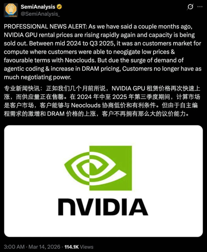 其实,这两件事指向磨灭个配景:应用层面的 AI 需求正在速即爆发,而在基础智力层面,悉数行业还莫得齐全准备好。算力、芯片、系统效率,这些正本荫藏在幕后的问题,正在被须臾放大的 AI 需求推到台前。一个比较赫然的发达是,算力租借行业依然出现加价潮,而况可能握续一段时期。关于想要搭上「龙虾」快车的企业来说,这无疑是一个亲自相干的变化。