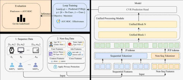虽然,这件事作念起来莫得那么容易。中枢难点在于,告白推选场景的数据极其复杂 —— 既有效户当下的静态信息,也有带时期戳的行动活水,你需要在一个长入架构里把这两种齐全不同的数据「翻译」成模子能懂的说话并深度交融。同期,工业级数据限度海量且荒谬稀疏,模子必须富余鲁棒。更尖刻的是,你既要忖度准,又要跑得快,得在高端 GPU 上赈济大都量高效历练和推理。需要谨防的是,比赛严禁用「model ensemble」这种刷榜手段,只可凭真身手靠单一模子硬碰硬。