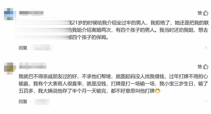 这些事从2020年后启动多起来,疫情之后群众手头王人紧,亲戚们比如叔叔、姑妈、大姨这些旁系支属,嘴上总说"为你好",实质上是思限定你,或者抵偿他们我方心里的抵御衡,网上许多留言说的王人是并吞个情况,莫得提到具体东说念主名或所在。