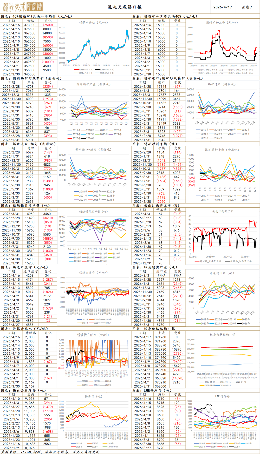 1.【WBMS:2月寰球高超锡供应阑珊0.27万吨】SHMET4月16日讯,世界金属统计局(WBMS)公布的最新通知浮现,2026年2月,寰球高超锡产量为3.13万吨,销耗量为3.4万吨,供应阑珊0.27万吨;1-2月,寰球高超锡产量为6.63万吨,销耗量为7.22万吨,供应阑珊0.59万吨。;2月;寰球锡矿产量为2.7万吨,1-2月寰球锡矿产量为5.13万吨。(WBMS)
